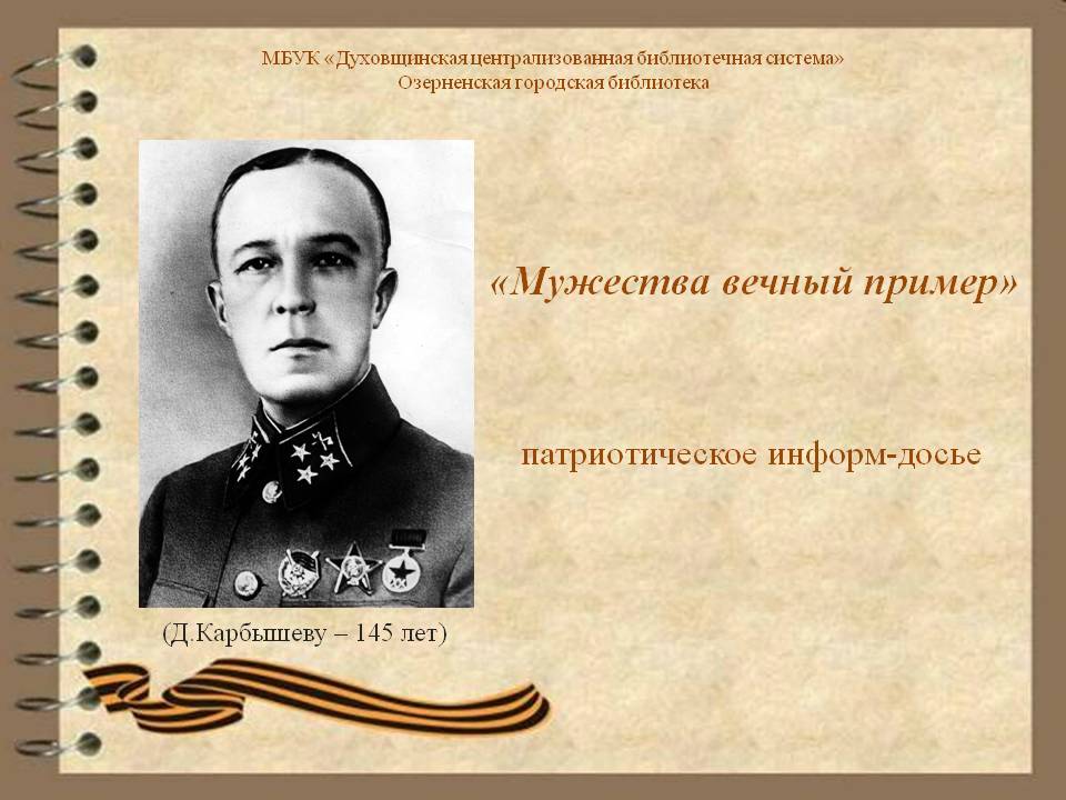 26 октября исполняется 145 лет со дня рождения Дмитрия Михайловича Карбышева, русского военного инженера, генерал-лейтенанта инженерных войск, профессора, доктора военных наук, Героя Советского Союза (посмертно). Он является автором более ста научных работ по военно-инженерному искусству и военной истории. К этой памятной дате Озерненская городская библиотека подготовила патриотическое информ-досье, которое знакомит с жизнью и подвигом героя.