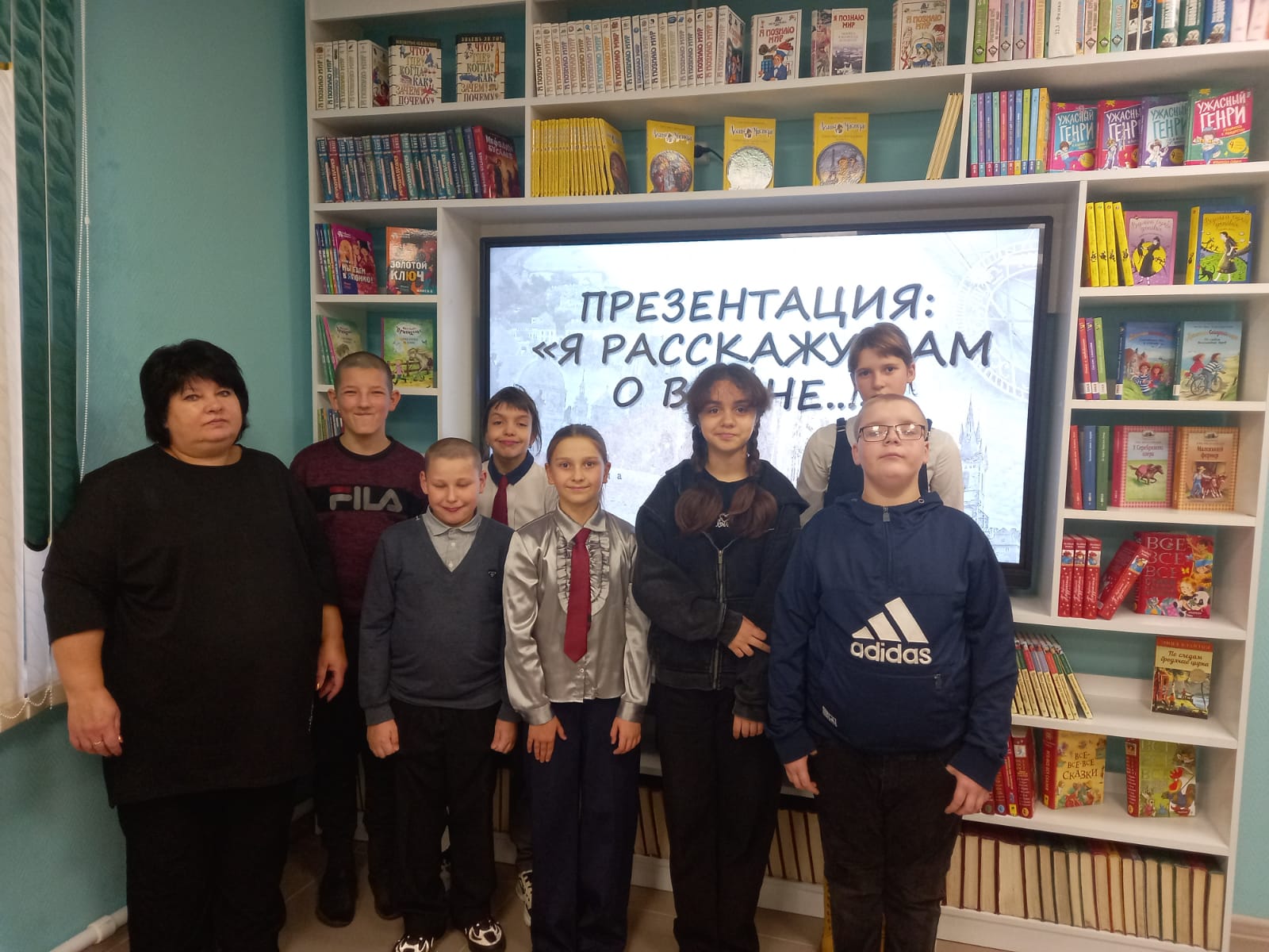 22 октября в районной детской библиотеке для учеников  школы-интерната для обучающихся с ОВЗ в рамках запланированных мероприятий патриотического объединения «Юные патриоты Росси» прошла презентация «Я расскажу вам о войне». Библиотекарь рассказала ребятам  о героических подвигах защитников Родины в разные годы. Побеседовала с ними о том, кого можно назвать защитником Отечества, какими качествами он должен обладать и зачем вообще нужно защищать Родину. В конце мероприятия ребятам была предложена викторина «Виды и рода войск».