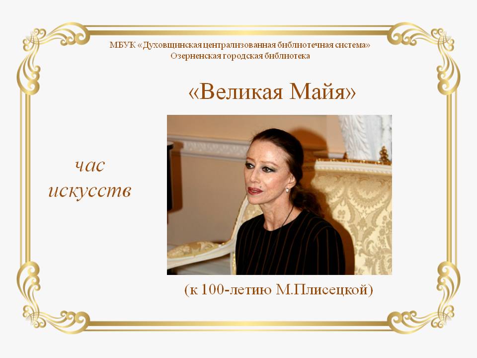 20 ноября исполняется 100 лет со дня рождения Майи Михайловны Плисецкой — одной из величайших балерин XX века, хореографа и писателя. Современники называли ее «первой леди танца», она прожила долгую и насыщенную жизнь, оставив России и мировой культуре богатое творческое наследие. К этой юбилейной дате Озерненская городская библиотека подготовила час искусств, который знакомит с жизнью и творчеством великой балерины.