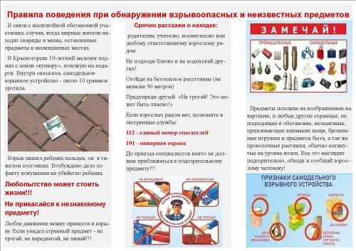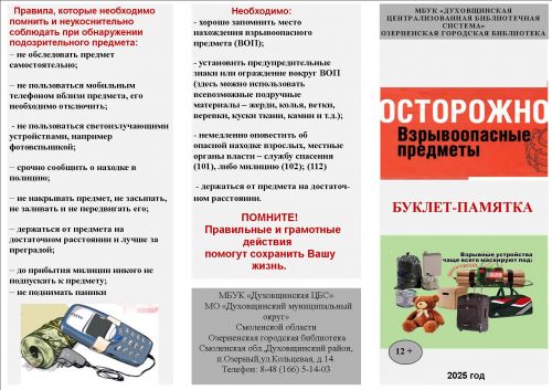 В связи с неспокойной обстановкой участились случаи, когда взрослые и дети находят подозрительные предметы, которые могут оказаться взрывными устройствами. Подобные предметы обнаруживают в транспорте, на лестничных площадках, на улице, в общественных местах. С целью предупреждения гибели людей при обнаружении взрывоопасных предметов Озерненская городская библиотека предлагает познакомиться с информационным буклетом-памяткой «Осторожно, взрывоопасные предметы».