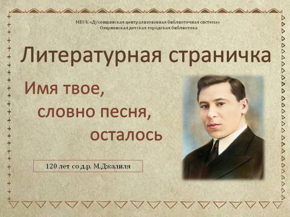2 февраля 2026 года исполнилось120 лет со дня рождения советского татарского поэта и журналиста, военного корреспондента М. Джалиля. К этой дате сотрудники Озерненской детской городской библиотеки подготовили литературную страничку "Имя твое, словно песня, осталось". Предлагаем ребятам ознакомиться.