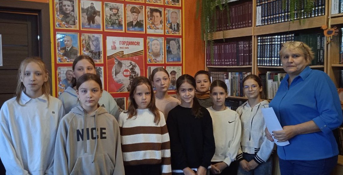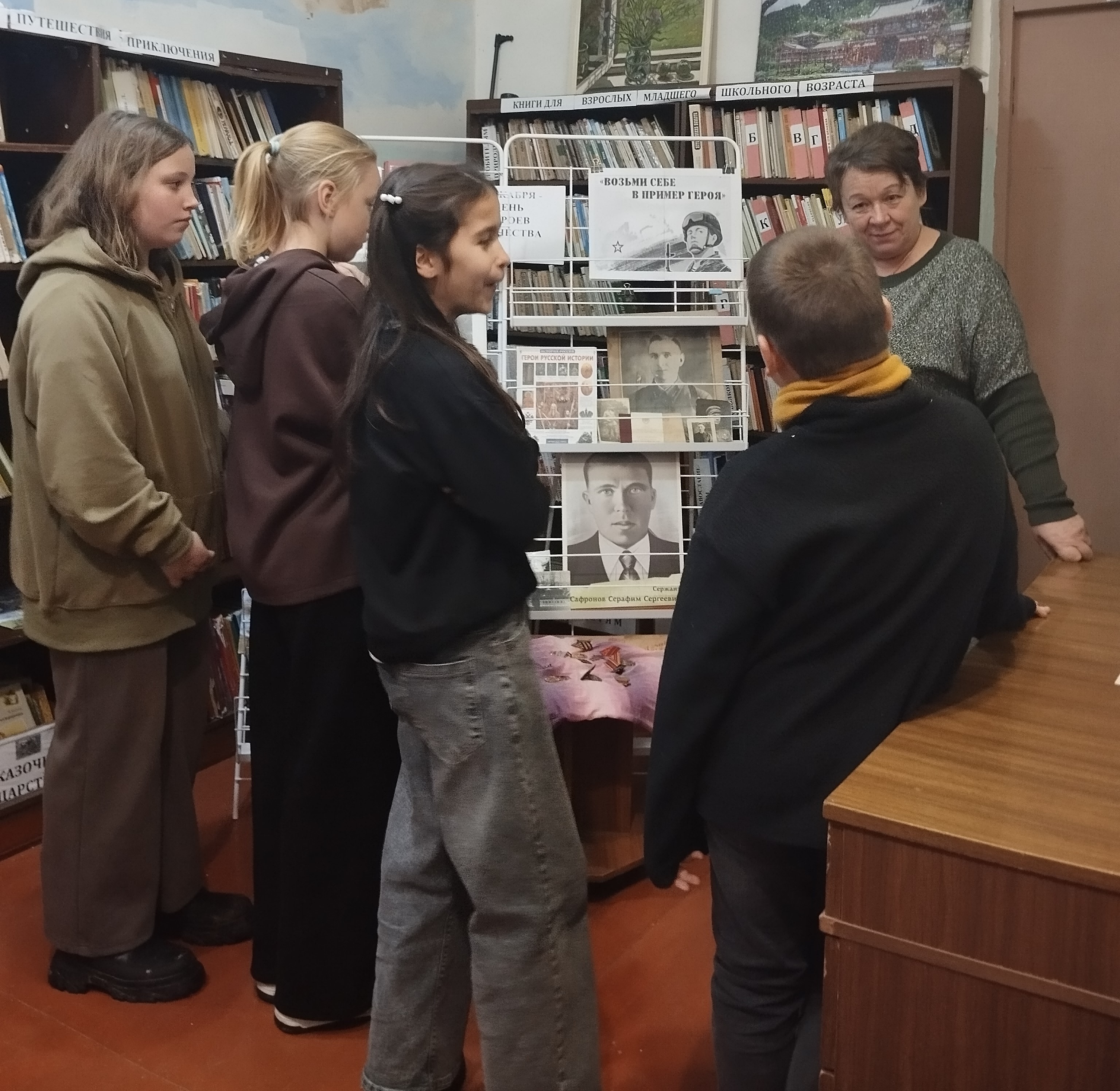 В честь Дня Героев Отечества в Пречистенской детской сельской библиотеке прошел урок мужества и осмысления «Кто такие герои?» Ведущие вместе с учащимися искали ответы на главные вопросы: Что делает человека героем? Все ли герои носят ордена? Может ли героем стать наш современник? В чём проявляется подвиг в мирное время? и другие. Беседа стала не просто рассказом о подвигах прошлого, а диалогом о ценностях, мужестве и гражданской ответственности. Библиотекари говорили о том, что героизм может проявляться не только на поле боя, но и в повседневной жизни — в готовности помочь, в профессионализме, в верности своему делу и людям. Для мероприятия была оформлена книжная выставка «Возьми себе в пример героя». Затем участники мероприятия посетили на дому бабушку героя участника СВО Раису Викторовну Л. Она рассказала детям о своем внуке, о том, как он стал героем. Дети внимательно слушали Раису Викторовну и смотрели видео с интервью самого героя.