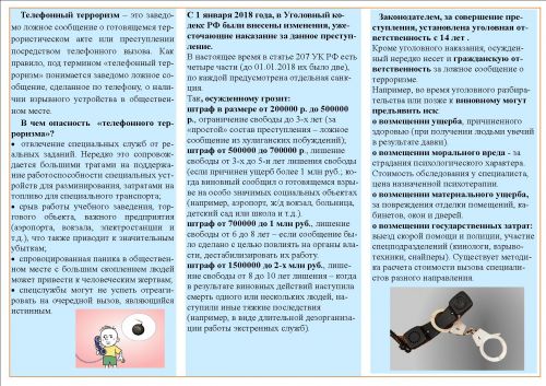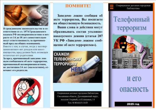 Телефонный терроризм - заведомо ложное сообщение о готовящемся акте терроризма или о заложенном устройстве. Терроризм – это вопиющее зло, несущее смерть многим невинным людям, разрушения, страдания и боль. Поэтому, отношение к тем, кто решил «пошутить», то есть заведомо ложно сообщил о заложенном взрывном устройстве или о готовящемся акте терроризма, должно быть отрицательное, осуждающее и наказуемое. С этой целью работники Озерненской детской городской библиотеки выпустили буклет «Телефонный терроризм и его опасность».